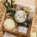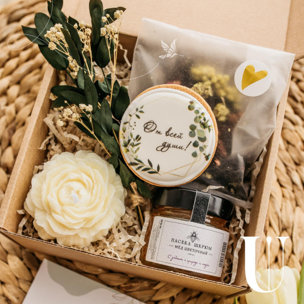 В Подарочный набор входит: ароматный чай таежный сбор, цветочный мед - для самых теплых мгновений, пряник ручной работы, красивая свечка пион и букетик, который будет радовать долгие годы, так как сухоцветы способны дарить радость очень долго