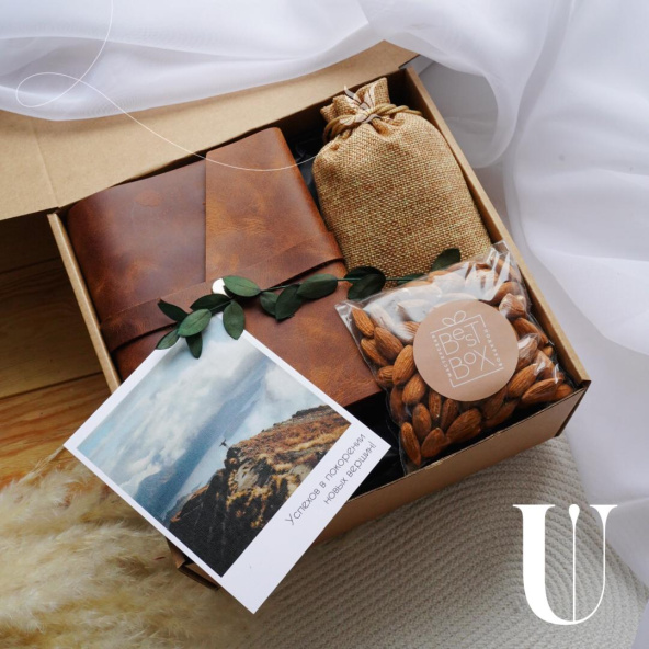 В составе подарочного бокса: ежедневник из натуральной кожи ручной работы 150х105 мм, ароматный чай в мешочке, миндаль (100 гр), небольшая открытка. Каждый подарочный набор упакован в дополнительную транспортировочную коробку с наполнителем, поэтому вы можете не переживать, что он будет доставлен в целости и сохранности!