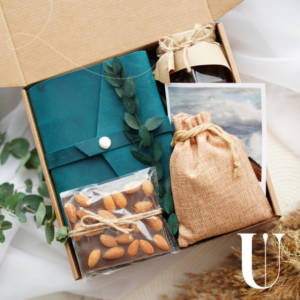 Подарок ручной работы. Подарочный набор"С праздником!" - идеальный вариант подарка для любимого, мужа, друга, брата, папы, дедушки, преподавателя, учителя, коллеги или сотрудника на работе. Такой душевный и оригинальный подарок ручной работы в стильной крафтовой коробке, перевязанный лентой и украшенный сухоцветами точно не оставит равнодушным вашего близкого человека! В составе подарочного бокса: ежедневник из винтажной натуральной кожи ручной работы (150х105 мм, 60 листов), ароматный чай в мешочке, баночка варенья с шишками, плитка темного шоколада с миндалем, небольшая открытка.