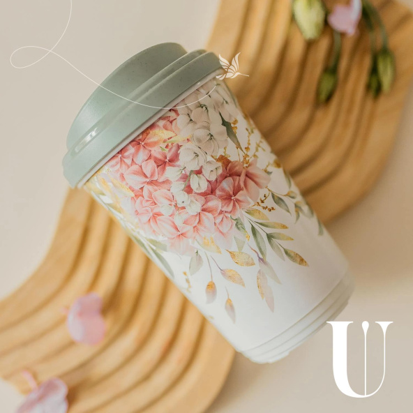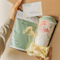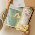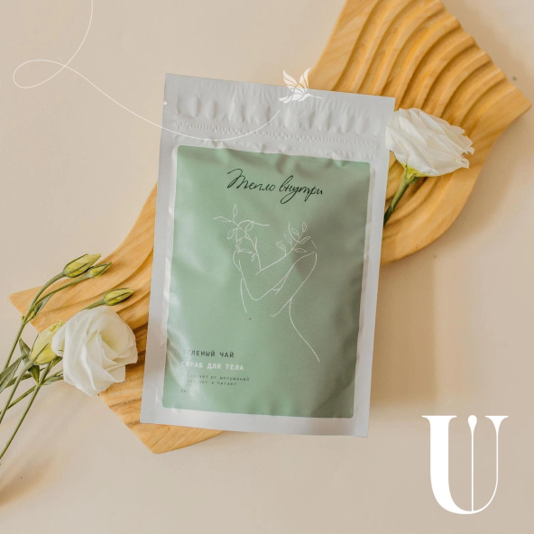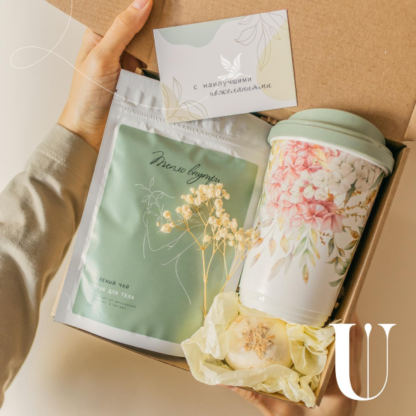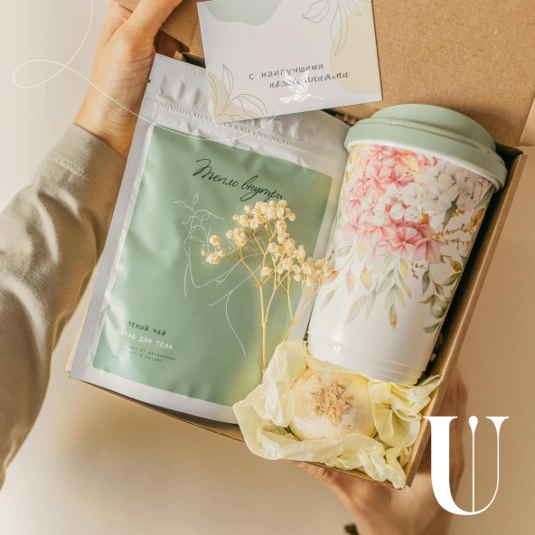 Скраб для тела "Зеленый чай", термостакан пластиковый, бомбочка для ванны, веточка гипсофилы, открытка