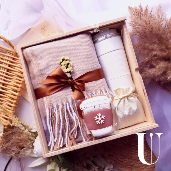 В составе подарочного бокса: теплый палантин, вкусный пряник с глазурью, термостакан, ароматный чай в мешочке, небольшая открытка.