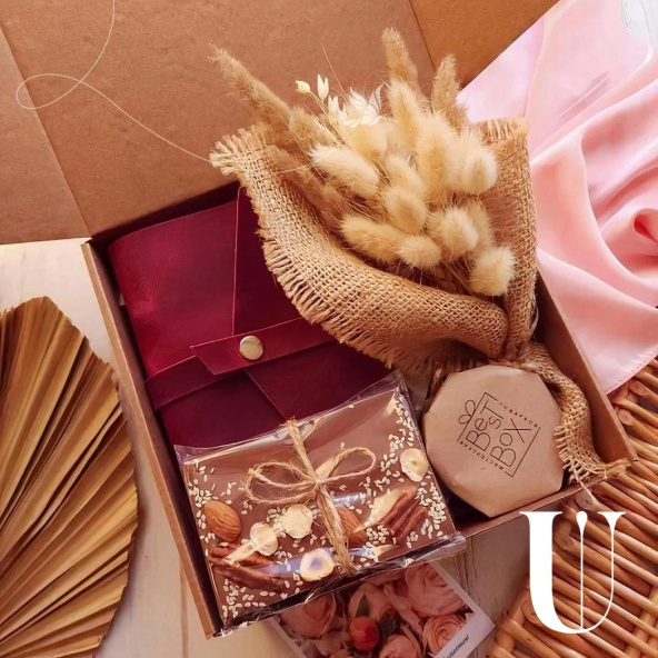 В составе подарочного бокса: мини-букетик сухоцветов, ежедневник из натуральной винтажной кожи ручной работы, баночка соленой карамели (110 гр), плитка молочного шоколада с орешками (60 гр), небольшая открытка.