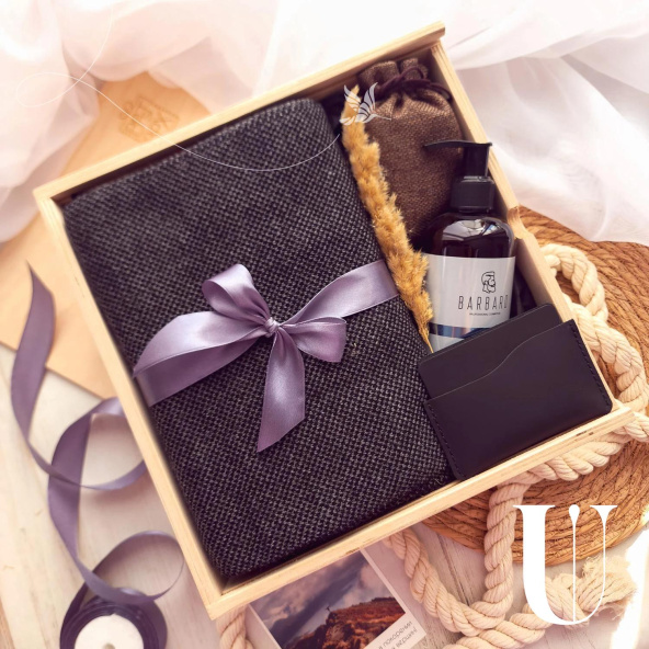 Подарочный набор "Для него" - идеальный вариант подарка для любимого мужчины, друга, брата, папы, дедушки, начальника, коллеги или сотрудника на работе, учителя, преподавателя. Такой душевный и оригинальный подарок ручной работы с шарфом, в стильной деревянной коробке, перевязанный лентой и украшенный сухоцветами точно не оставит равнодушным вашего близкого человека! В составе подарочного бокса: теплый мужской шарф 130х24 см (шерсть 70%, кашемир 5%, акрил 20%, шерсть альпаки 5%), мужской профессиональный шампунь "3 в 1" (250 мл), картхолдер из натуральной винтажной кожи ручной работы, ароматный чай в мешочке (50 гр) и небольшая открытка.