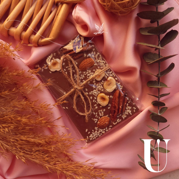 - молочный шоколад ручной работы с пеканом. миндалем и фундуком;