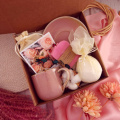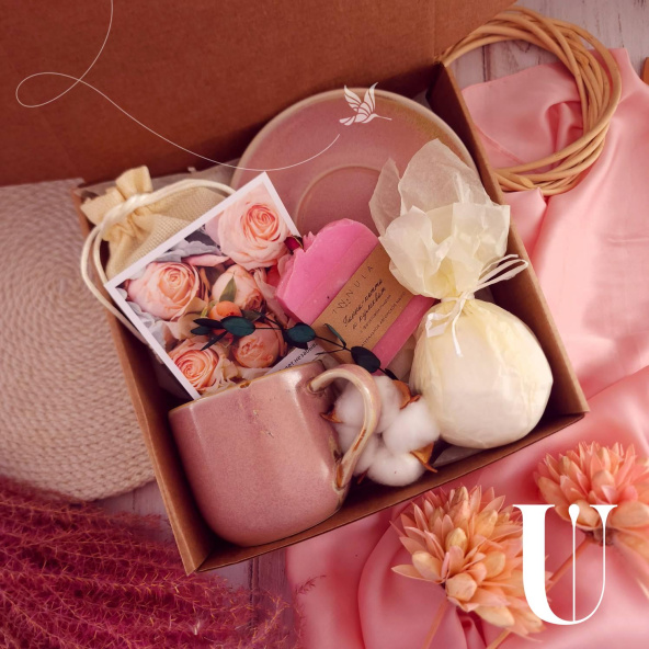 В составе подарочного бокса: кружка и блюдце из премиального фарфора, покрытые розовой глазурью; ароматный чай в мешочке (50 гр); цветочная бомбочка ручной работы; натуральное крафтовое мыло; небольшая открытка. Каждый подарочный набор упакован в дополнительную транспортировочную коробку с наполнителем, поэтому вы можете не переживать, что он будет доставлен в целости и сохранности!