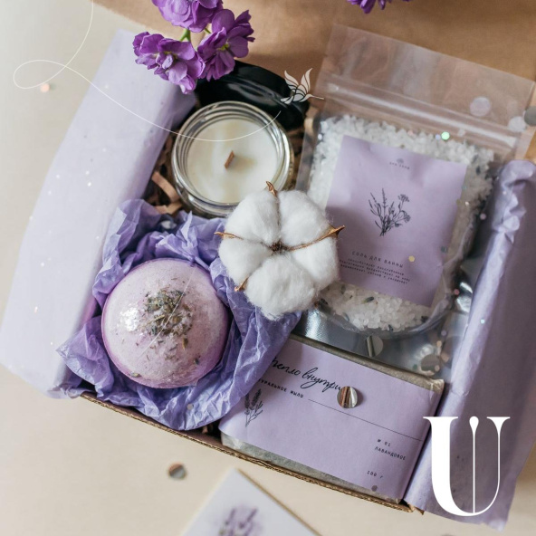 Соль для ванн с лепестками лаванды, Мыло ручной работы, бомбочка для ванн, соевая свеча в баночке, бутон хлопка, открытка.