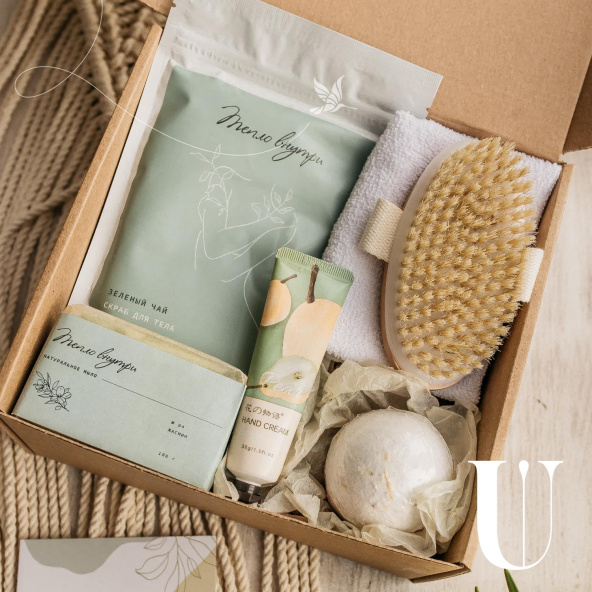 Скраб для тела, махровая салфетка для лица и рук, массажная щетка для тела, мыло ручной работы, бомбочка для ванн, крем для рук, открытка.