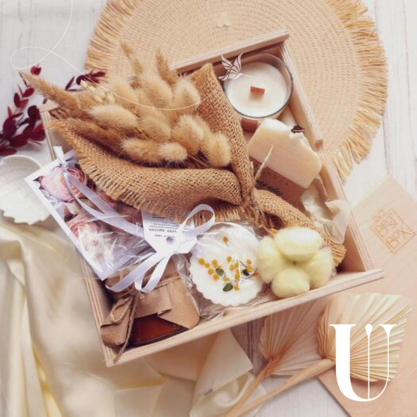 В составе подарочного бокса: небольшой букетик сухоцветов, ароматная соевая свеча, натуральное мыло ручной работы, баночка клюквенного джема (110 гр) , соевое саше с сухоцветами, открытка "С наилучшими пожеланиями!"; декор. Каждый подарочный набор упакован в дополнительную транспортировочную коробку с наполнителем, поэтому вы можете не переживать, что он будет доставлен в целости и сохранности!