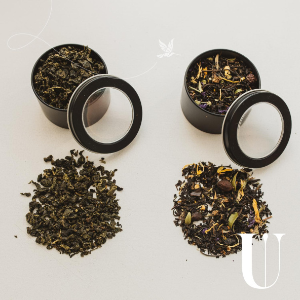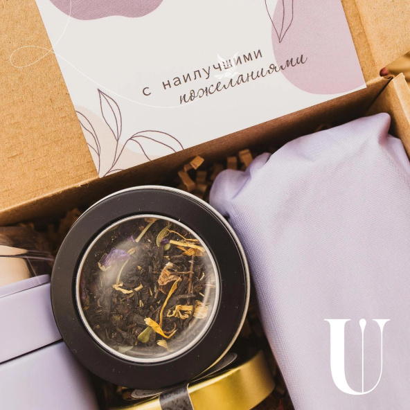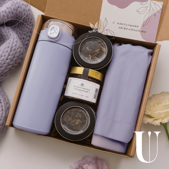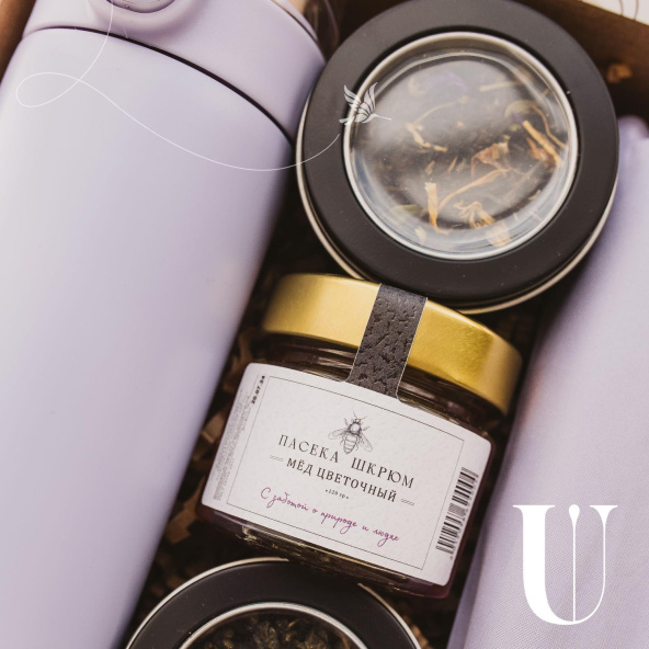 В него входят: миниатюрный зонтик, термос, два вида чая (таёжный сбор и молочный улун), баночка мёда и открытка.