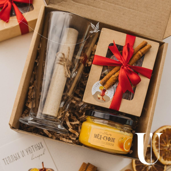 Подарочный набор для сказочных вечеров. В него входят: бокал, специи, инструкция для глинтвейна, мёд-суфле с апельсином и открытка для важных слов.