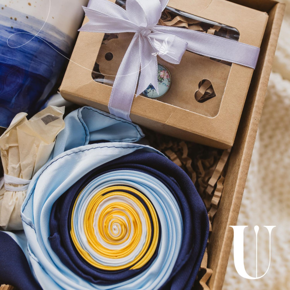 Подарочный набор из кружки, броши, шейного платка, свечи и чая