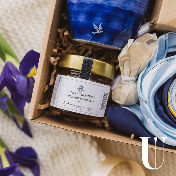 Подарочный набор из шейного платка, керамической кружки, меда-суфле, броши и кокосовых конфет