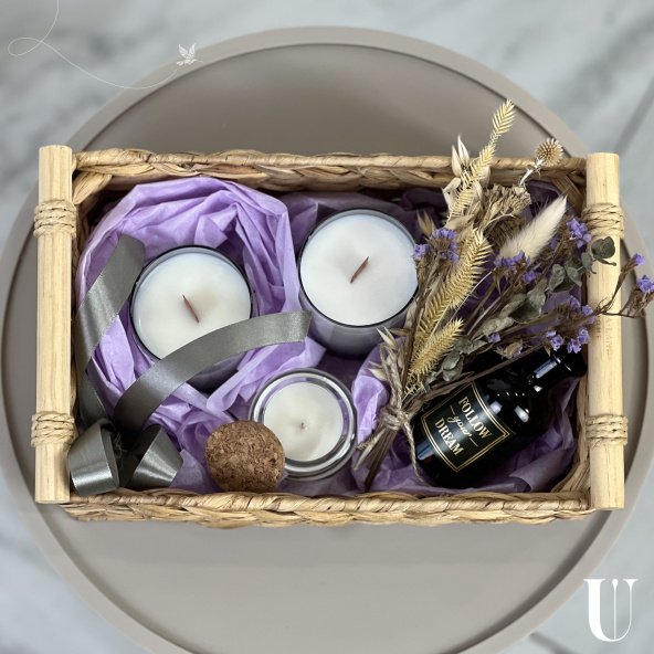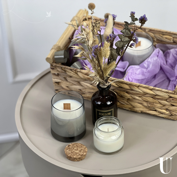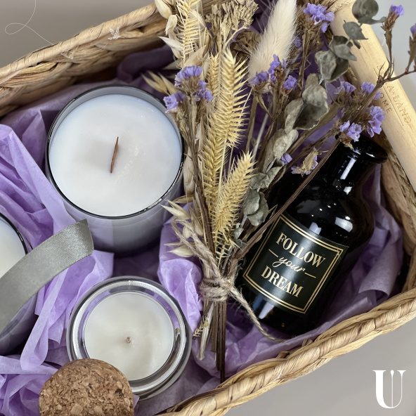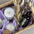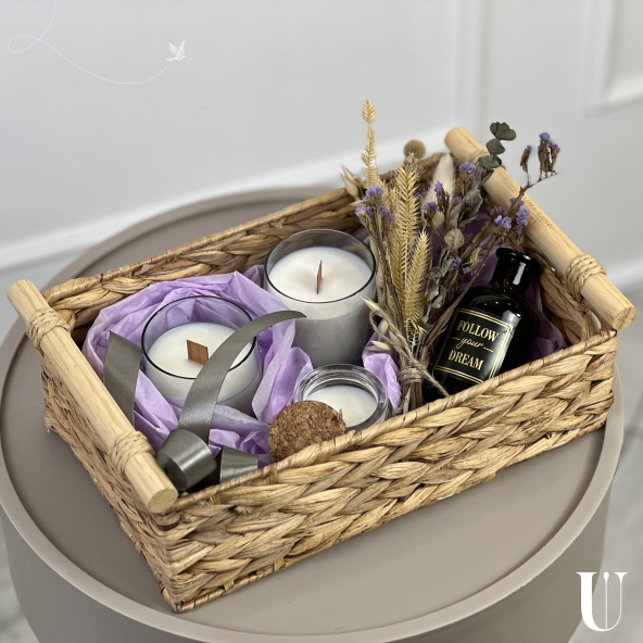 «Дельфия» - идеальный подарок для себя или любимого человека, наполненный ароматами и уютом. Он упакован в элегантную плетеную корзинку из натурального материала.