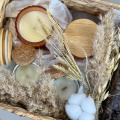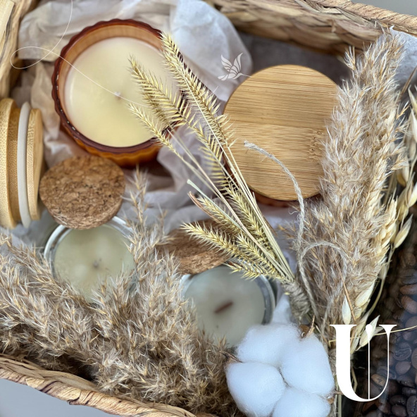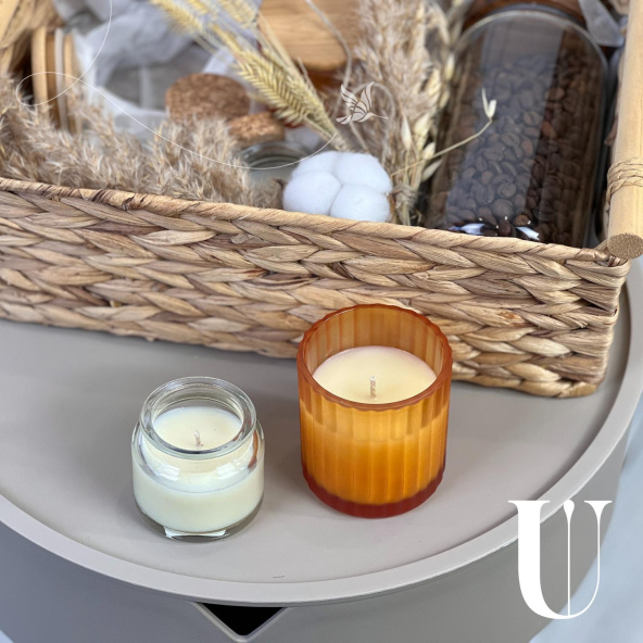 - Ароматические свечи ручной работы из натурального соевого и кокосового воска. Свеча выполнена в небольшом стеклянном подсвечнике с крышкой из пробкового материала. Объем свечей 2 по 140 мл, 2 по 70 мл.