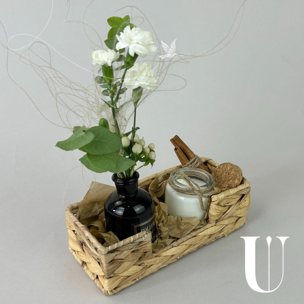 Подарочный набор в плетеной корзине с букетом из живых цветов и ароматической свечой.