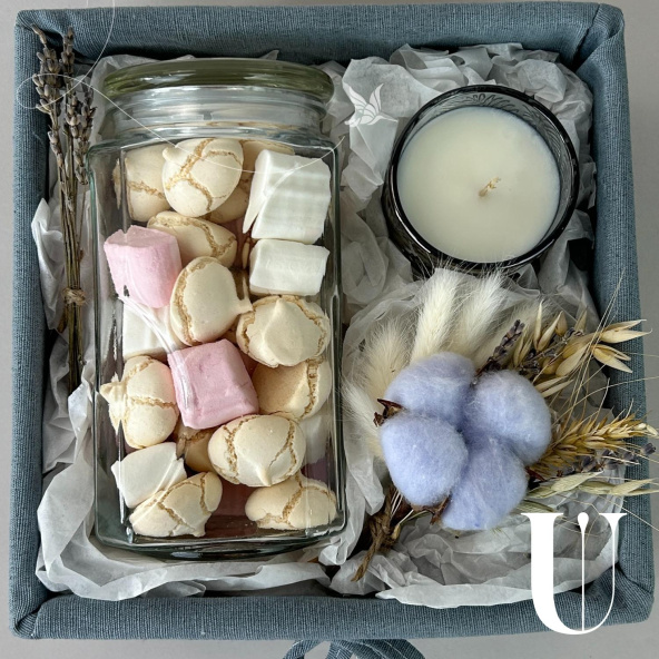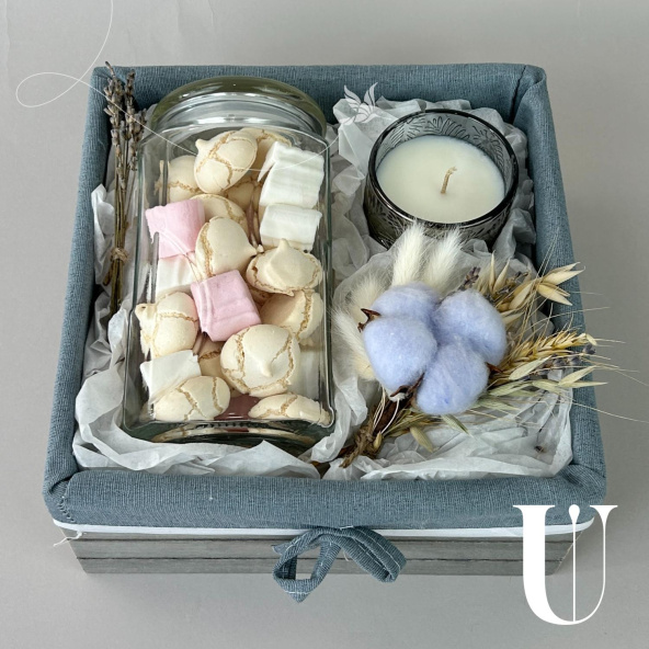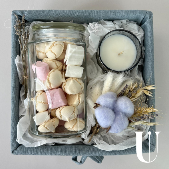 - Стеклянная банка со сладостями. Нежные маршмеллоу и сливочное безе станут отличным дополнением к чаепитию в кругу семьи. Банка может использовать для хранения различных сыпучих продуктов, а герметичная крышка надежно защищает содержимое от внешних факторов.