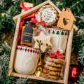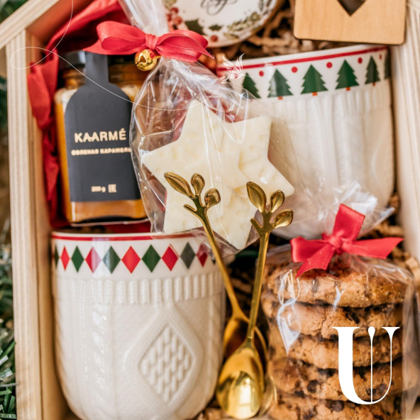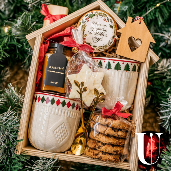 Подарочный набор из палантина, термостакана, пряника, ароматного чая и небольшой открытки
