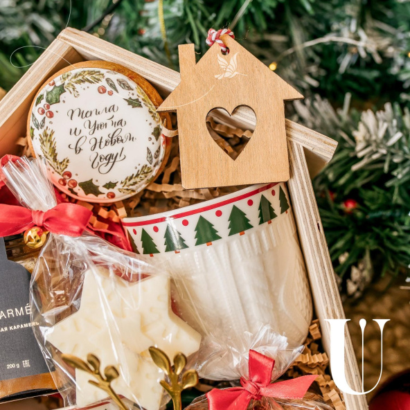 Подарочный набор из кружки с вязанным чехлом, флорентийской аромасаше, соевой свечи, чая в мешочке, вязанных носочков и небольшой открытки