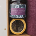 Подарочный набор из букетика крымской лаванды, баночки меда, ложки-веретено, ассорти орехов в шоколаде, листового чая и открытки