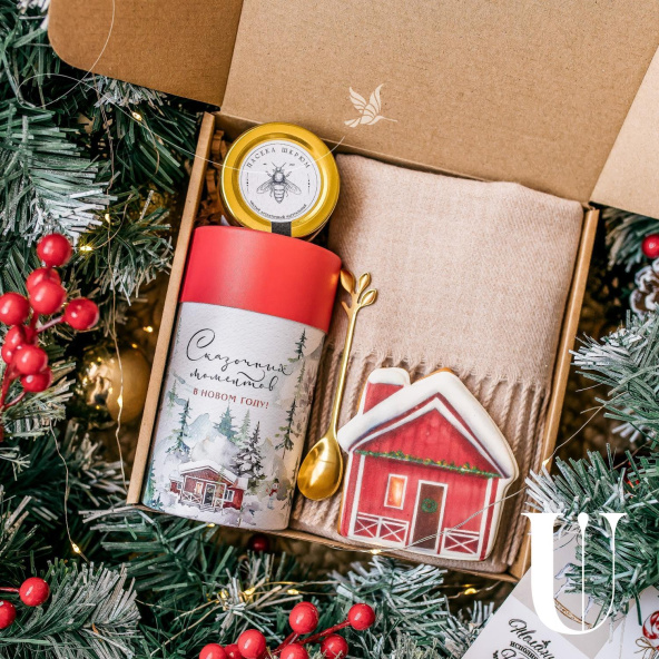 Подарочный набор из шарфа, двух видов чая, варенья и открытки