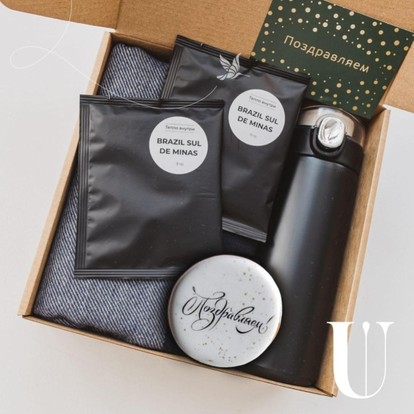 Подарок, который понравится любому мужчине. Шарф в темных оттенках окутает своим теплом, термо-кружка наполнит согревающим кофе, а медово - имбирный пряник и кокосовая конфета будут идеальным сладким дополнением