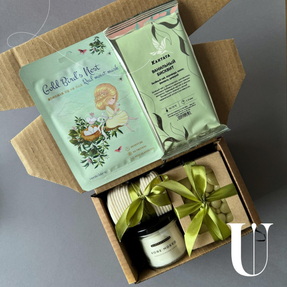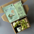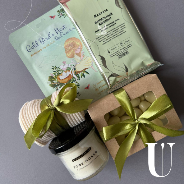Подарочный набор из соленого миндаля, плитки шоколада, кофе в дрип-пакетах и октрытки