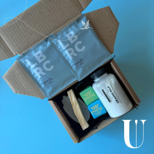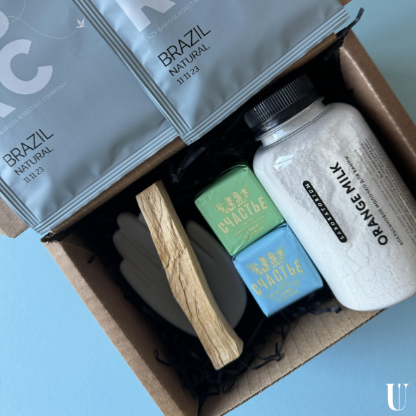 Подарочный набор из соленого миндаля, плитки шоколада, кофе в дрип-пакетах и октрытки
