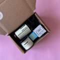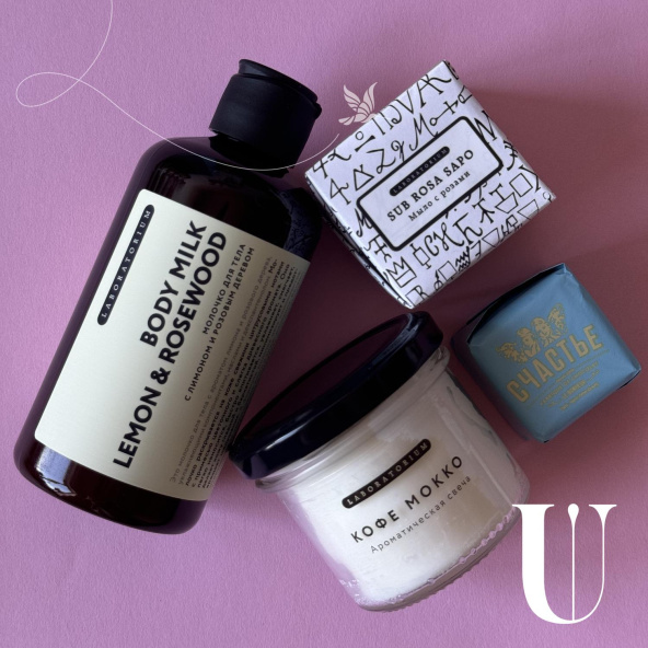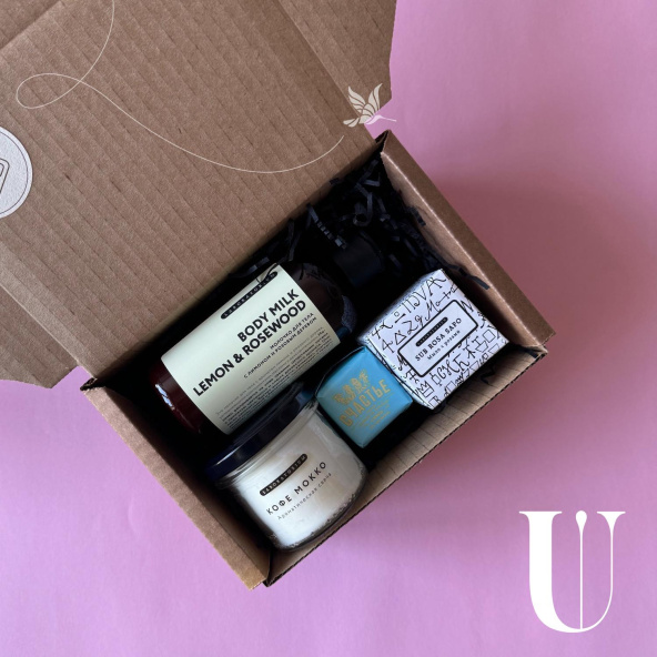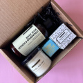 Бьюти-бокс с ароматической свечой и уходовыми средствами.