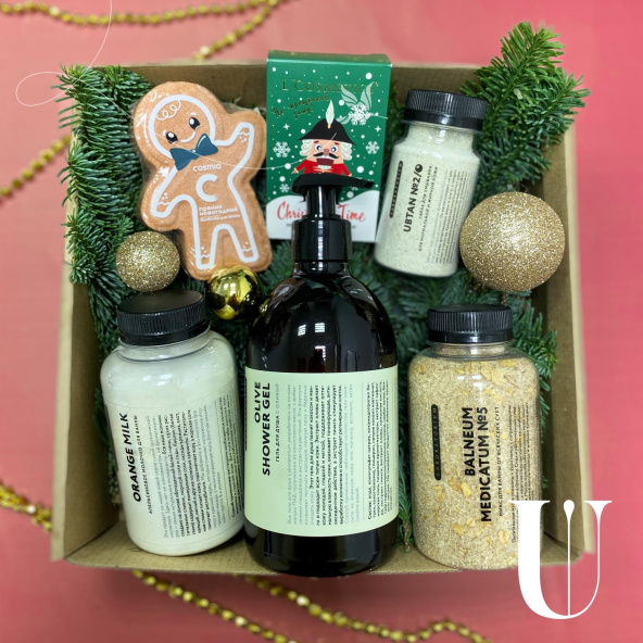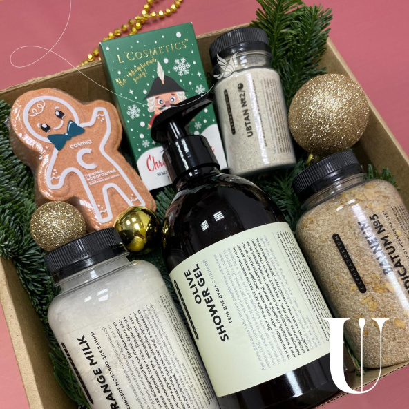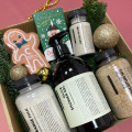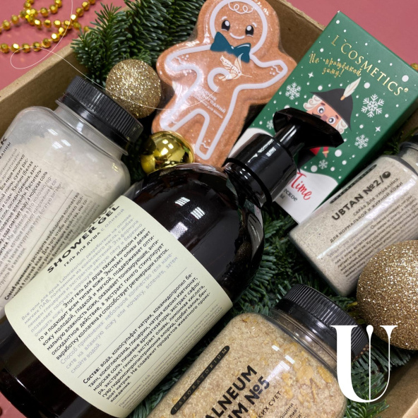 Новогодний подарочный набор со уходовыми средствами. Набор собран в крафтовой коробке с крышкой, украшен датской елью (нобилисом) и новогодним декором.