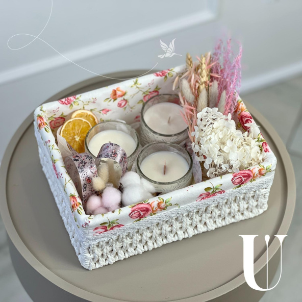 Подарочный набор «Элоди» с ароматическими свечами и сухоцветами в интерьерной корзинке.