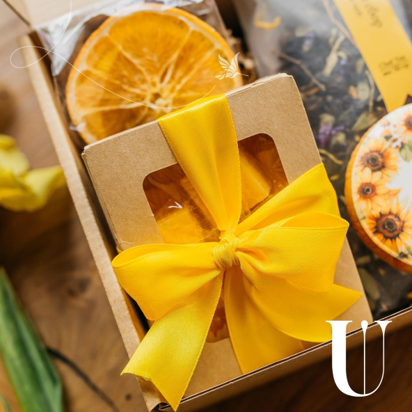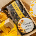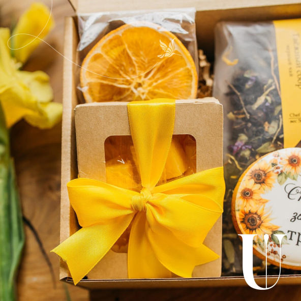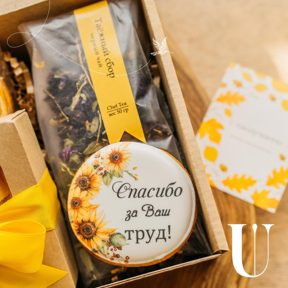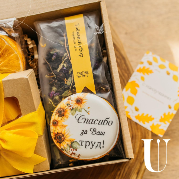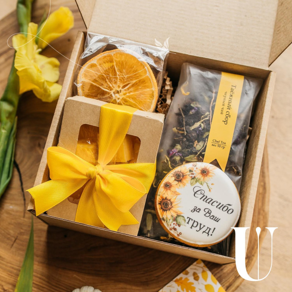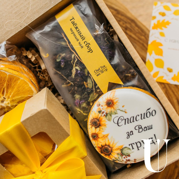Этот подарочный набор — воплощение тепла, благодарности и заботы. В его составе: изысканный чёрный чай «Таёжный сбор», который согреет в холодные дни, ароматный сушёный апельсин для создания уютной атмосферы, вкуснейший пряник с надписью «Спасибо за Ваш труд!», а также коробочка манговых конфет для любителей сладкого! Всё это упаковано в крафтовую коробочку с яркой жёлтой лентой, символизирующей радость и позитив. Такой подарок идеально подойдёт для выражения признательности и станет прекрасным дополнением к любому чаепитию.