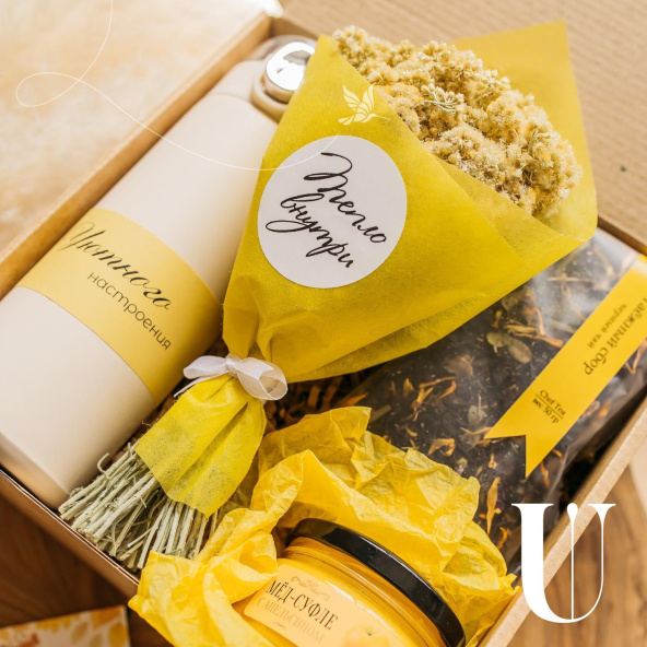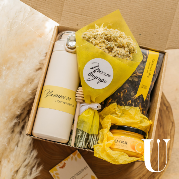 Этот набор — идеальный подарок для тех, кто ценит уют и заботу. В нем собраны только самые приятные и полезные вещи: ароматный травяной чай «Таёжный сбор», который согреет в холодные дни, нежный мёд-суфле с цитрусовым вкусом для сладкого удовольствия, стильный термос, чтобы наслаждаться любимыми напитками в любое время, и букетик яркого ароматного иммортеля. Завершает композицию открытка с теплыми пожеланиями, которая добавит вашему подарку особую душевность. Подарите радость и уют с этим набором!