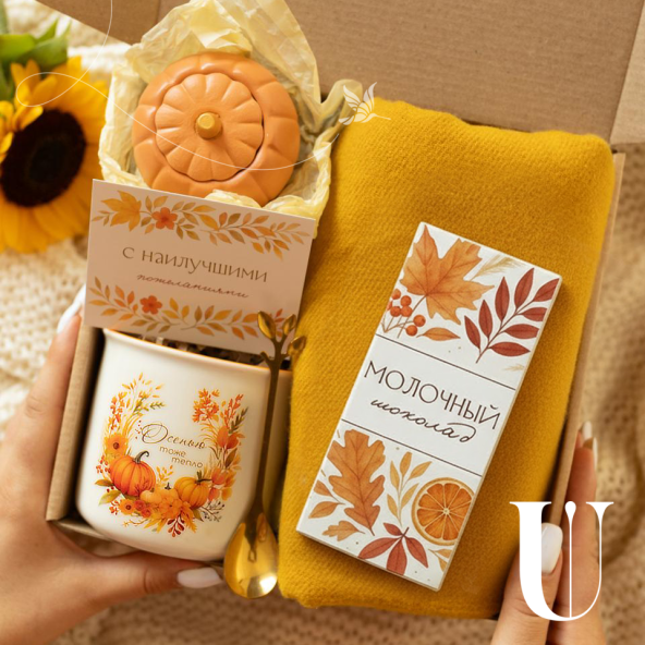 Подарочный набор из маршеллоу, кружки, ароматного чая, миндаля и медовой свечи в форме тыквы