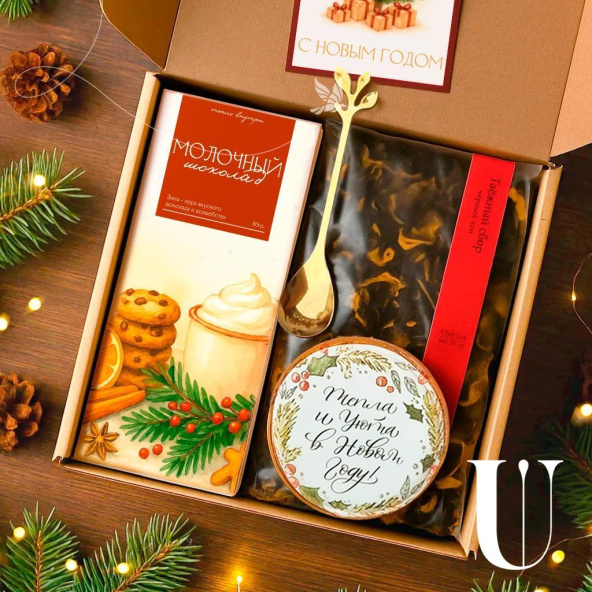Подарочный набор из черного чая, кружки, пряника и открытки