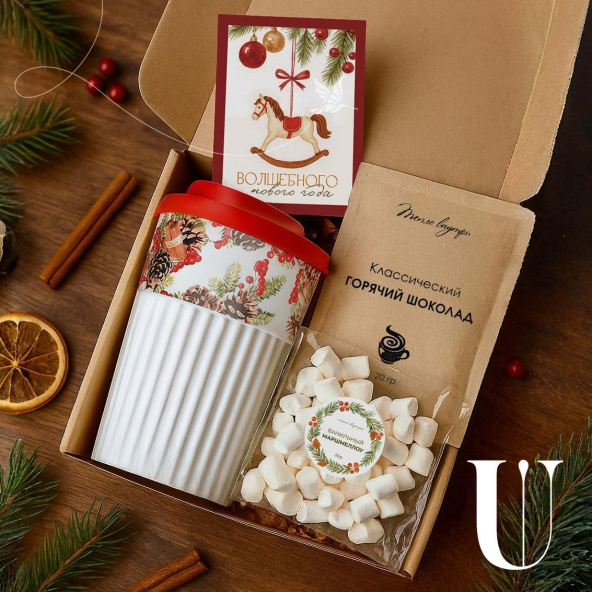 Подарочный набор из бокала, варежек, горячего шоколада и воздушного маршмеллоу