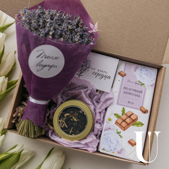 Подарочный набор "Подарочный набор с букетом лаванды, шоколадом и чаем"