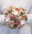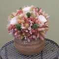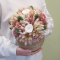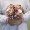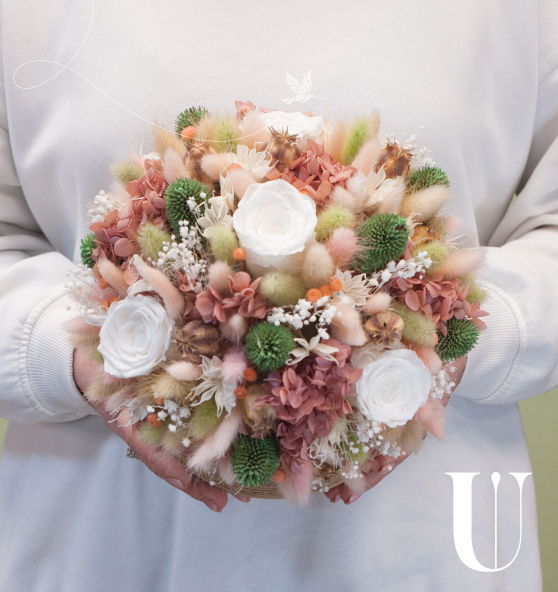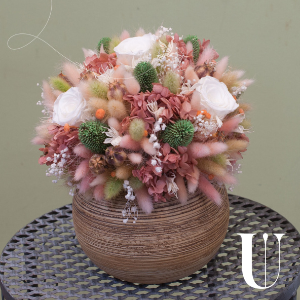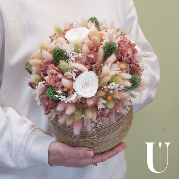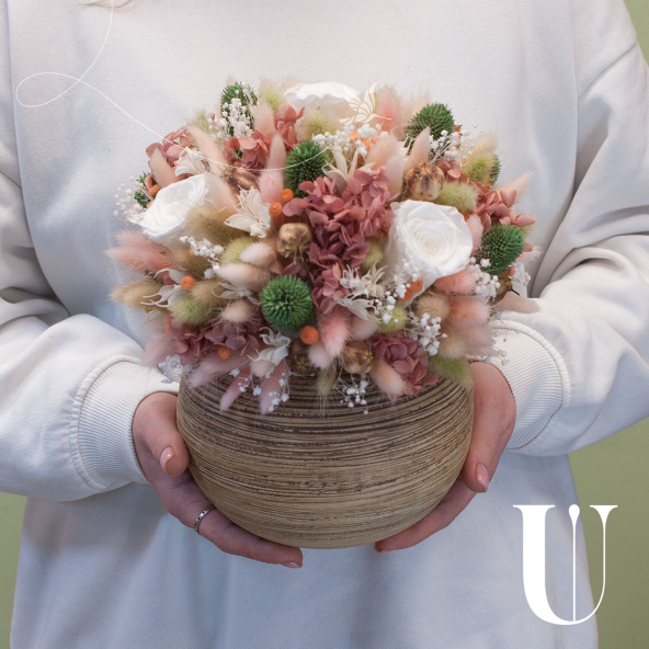 В составе композиции вы найдете гортензию, лагурус, розу и другие виды сухоцветов. Все они стабилизированы, что позволяет сохранить их первозданный вид на долгое время.