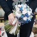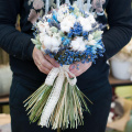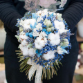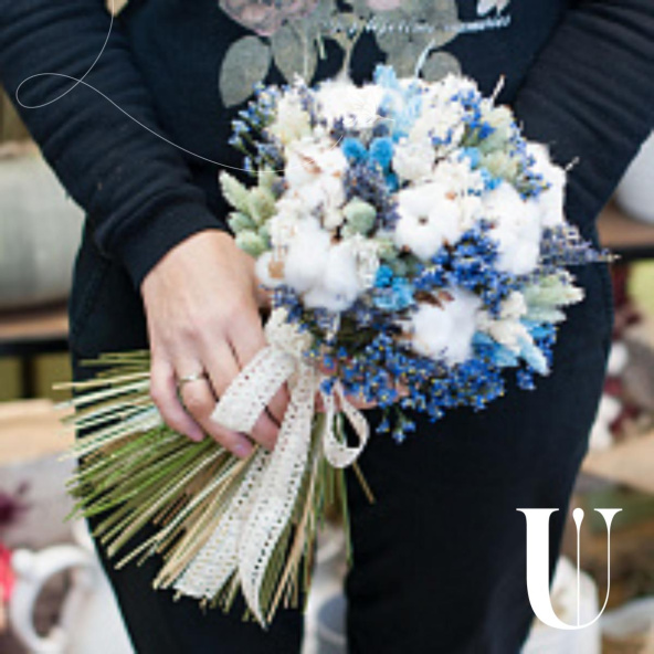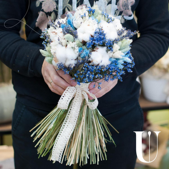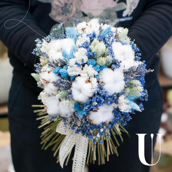 Букет сухоцветов в бело-синей гамме из лаванды, хлопка, фаларисов, фенхеля, лимониума.