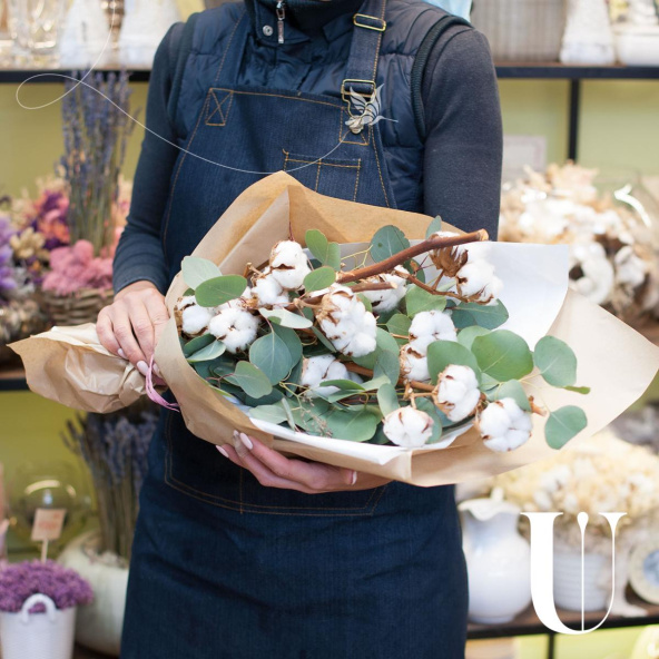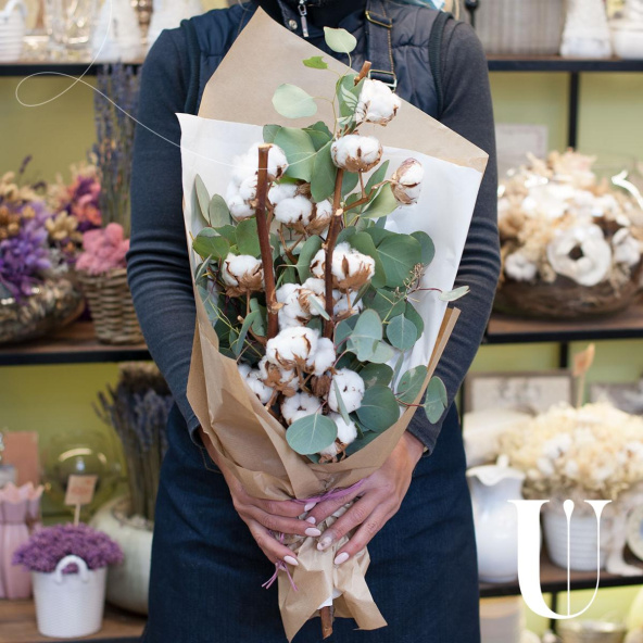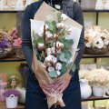 Композиция в бело-сиреневых тонах из лагуруса, хлопка и лаванды