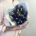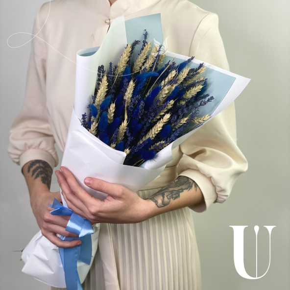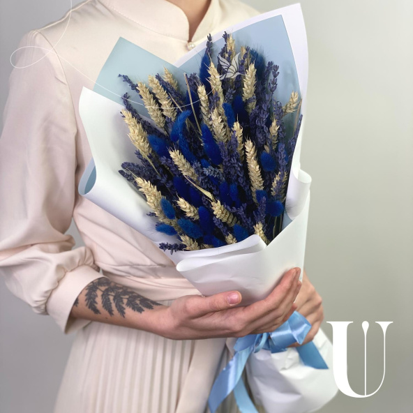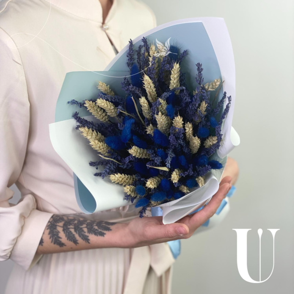 Упаковка: пленка дизайнерская белая, голубая, лента белая