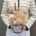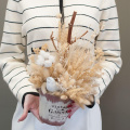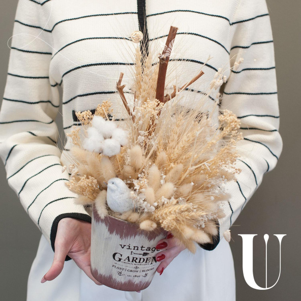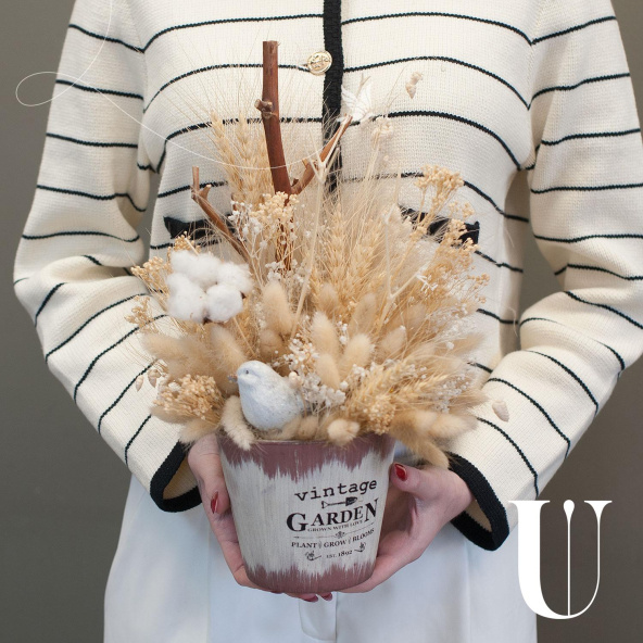 В одной упаковке находится одна композиция из сухоцветов в дизайнерском кашпо с сувениром "Гарден".