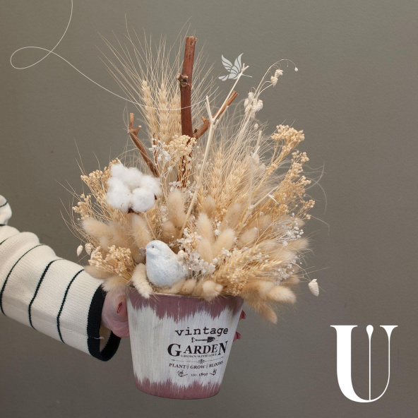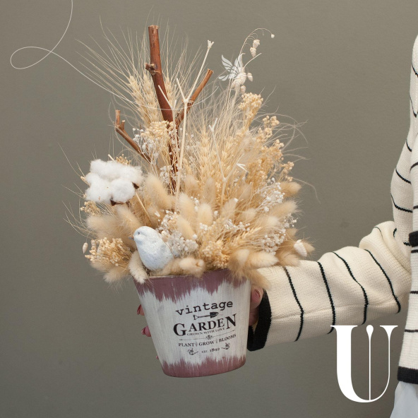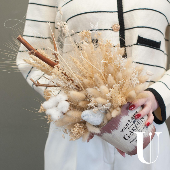 В составе композиции вы найдете лагурус, пшеницу, сухоцветы, гипсофилу, лен и хлопок. Такое разнообразие цветов и растений создает уникальную атмосферу и придает композиции неповторимый вид.