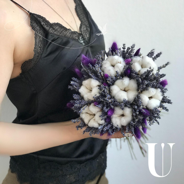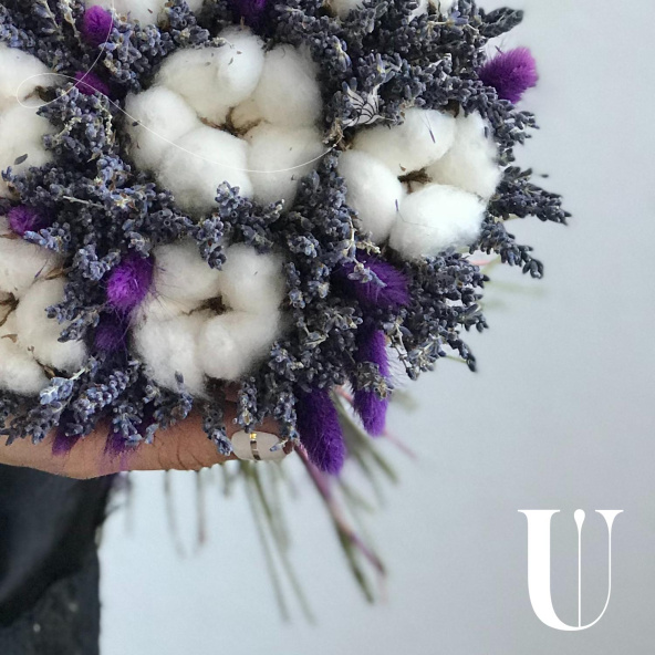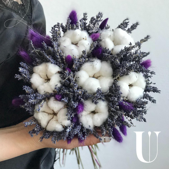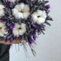 Букет собран из лаванды, хлопка и сиренивого лагуруса