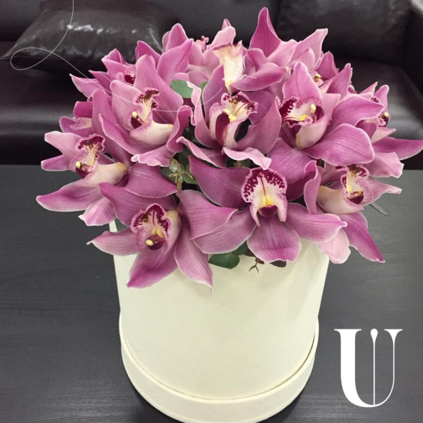 Мини-композиция из 9 белых орхидей в белой шляпной коробке