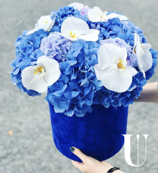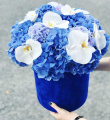 Бархатная коробка цвета ультрамарин с синими и голубыми гортензиями и белыми орхидеями