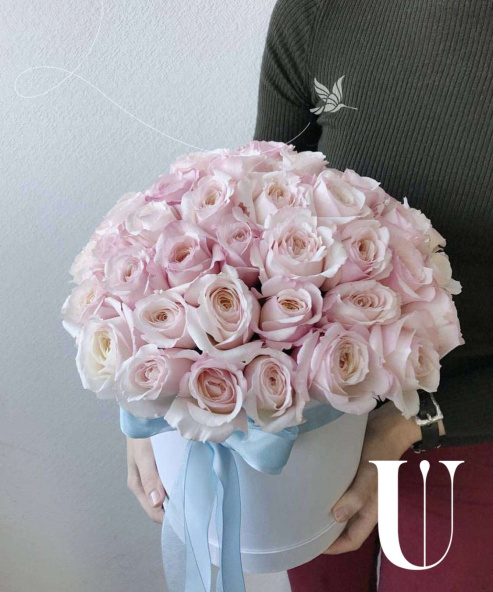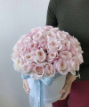 Цветы в шляпной коробке "Большая голубая коробка с нежными розовыми розами"